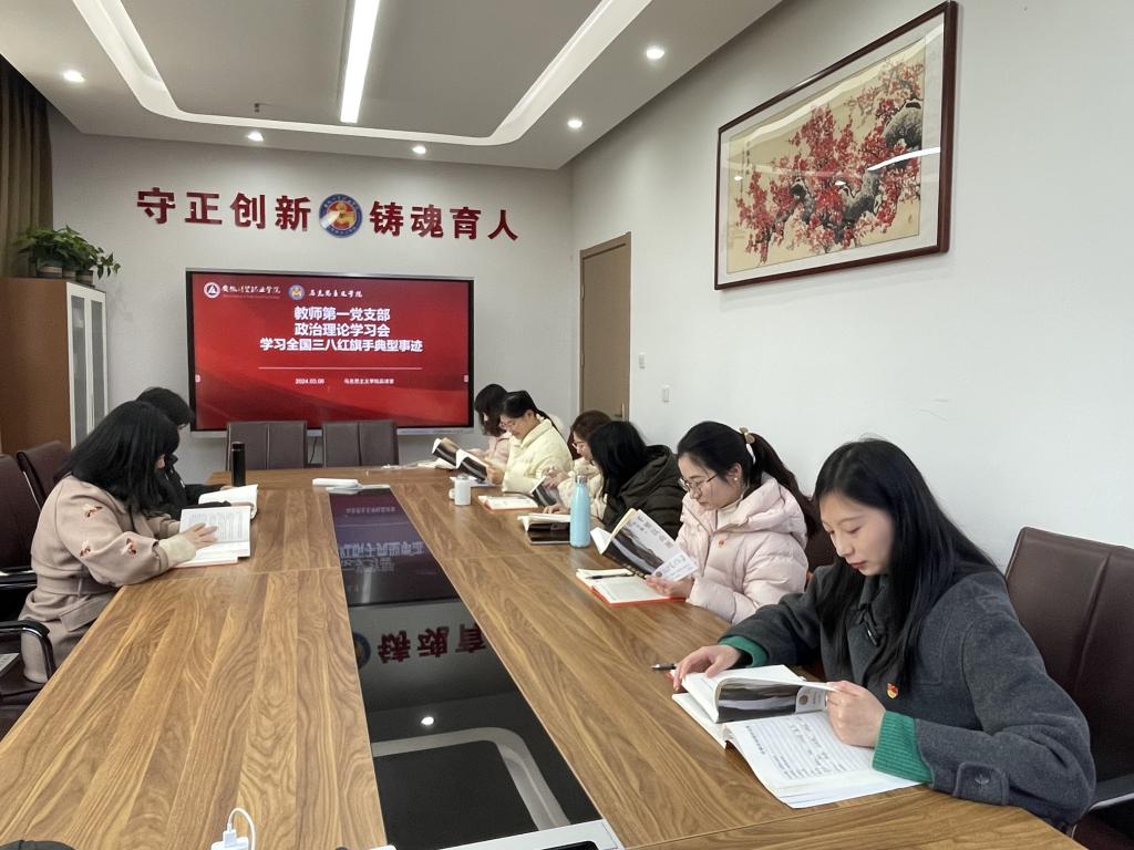 为庆祝“三八”国际妇女节,弘扬新时代女性风采,学习巾帼建功精神,3月6日下午,马克思主义学院教师第一党支部召开了向全国三八红旗手标兵、全国三八红旗手学习的活动,党支部全体教师参加了会议。
