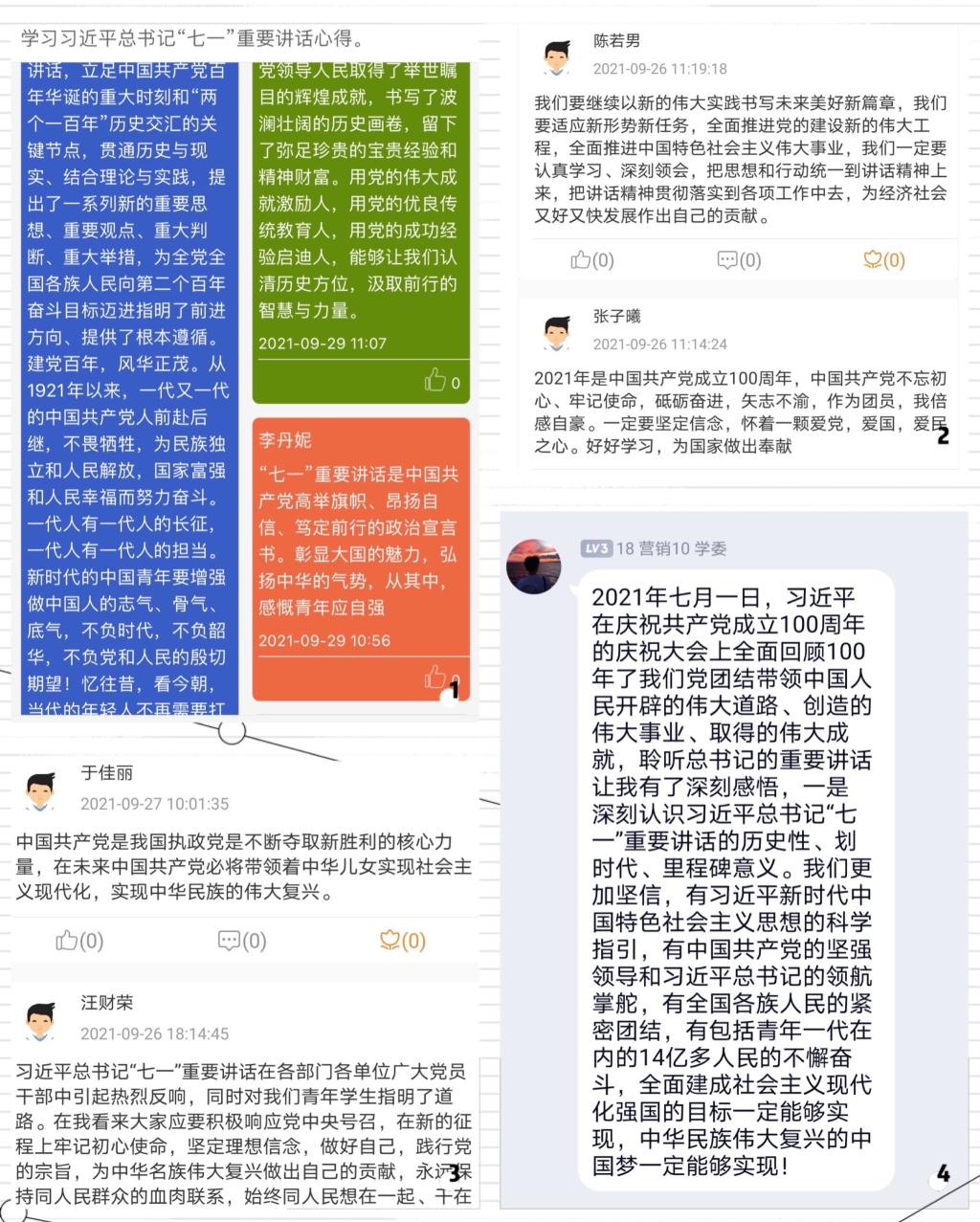 通过本次课堂学习,同学们深刻感悟到习近平新时代中国特色社会主义思想的磅礴伟力,引发了强烈的共鸣,大家纷纷表示:习近平总书记的“七一”重要讲话,回望了光辉历史、擘画了光明未来,展现了中国共产党的政治担当、历史自觉、人民立场和复兴使命。身为一名新时代青年学子,深感建党百年之艰辛、勇毅与伟大,“请党放心、强国有我!”我们必将以实现中华民族伟大复兴为己任,不断提高自身素养与能力,以青春之我在感悟时代伟力中不负韶华,以奋斗之我在紧跟时代步伐中放飞梦想!