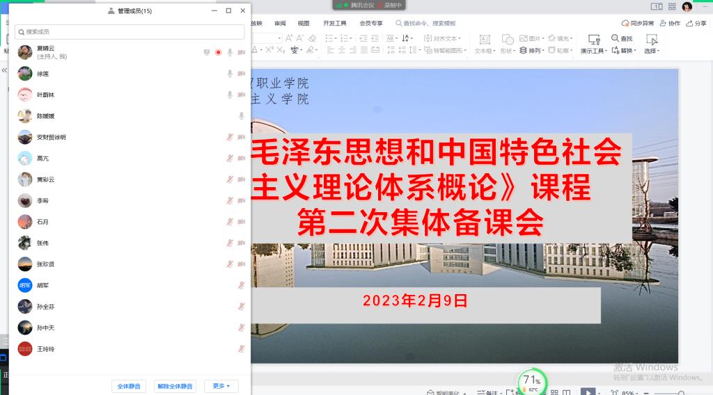 为提高教学质量,增强课程建设,确保新学期的教学效果,2月9日晚上,马克思主义学院线上开展了《毛泽东思想和中国特色社会主义理论体系概论》课程第二次集体备课会。会议由教研室主任徐莲教授主持,该门课程全体教师参加。