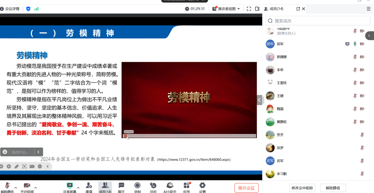 胡军老师就专题课内容从生产劳动构成、劳模精神内涵、生产劳动与劳模精神之间的内在关系进行阐释,同时就课程教学中的重难点,分享了自己的教学思路。教研室主任洪妮要求,所有授课教师都要结合学情,狠抓课堂教学质量,扎实有效地推进《劳动教育》课程建设。