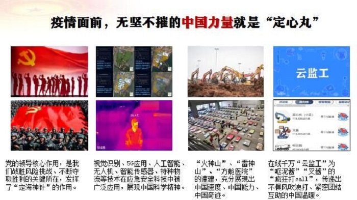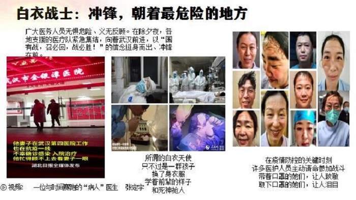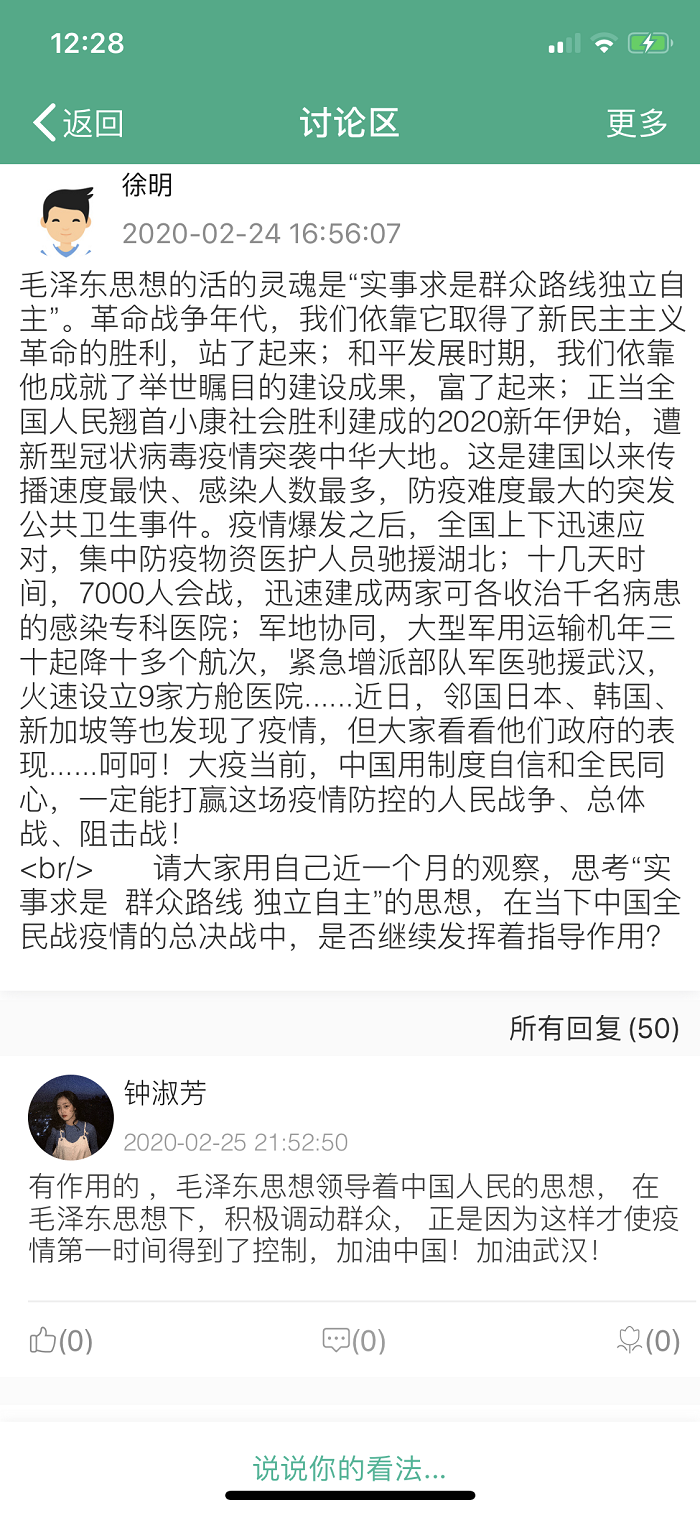 徐明教授梳理了疫情发生以来,中国共产党的坚强领导及中国各级政府迅速有效的应急响应及强有力措施,特别提到了建设火神山医院、雷神山医院这样的中国速度,提到了全国各地、医护、人力、物资驰援武汉驰援湖北这样的中国力量,提到了以人为本建立方舱医院这样的中国智慧。徐明教师在课堂上动情地表述: 大疫当前,中国用制度自信和全民同心,一定能打赢这场疫情防控的人民战争、总体战、阻击战。她希望同学们用自己的双眼、双耳从身边开始用心观察这场没有硝烟的战争,并从中切实领会毛泽东思想活的灵魂,将所见所感所闻留言在课程的讨论区。