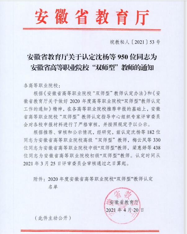 2020年度安徽省高等职业院校“双师型”教师认定名单