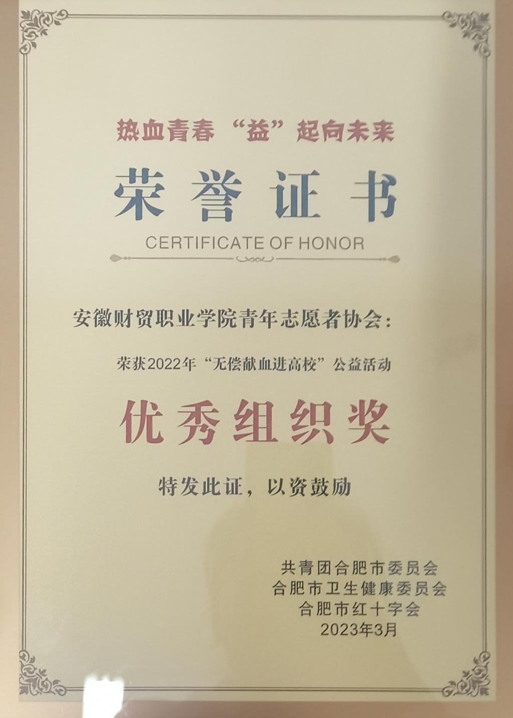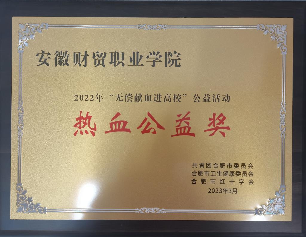 3月22日下午,由合肥团市委、市卫健委、市红十字会联合举办的2022年“无偿献血进高校”公益活动表彰暨2023年启动会在安徽省血液中心举行。我校荣获“热血公益奖”,青年志愿者协会荣获“优秀组织奖”。