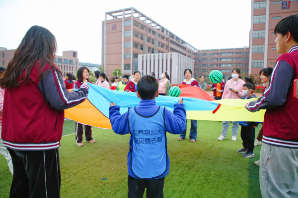 在融合运动会上,学校15名学子先后带领40多名“来自星星的孩子”与合肥安生学校的学生一起参加拔河比赛、行走的毛毛虫、接力风火轮和疯狂彩虹伞等趣味运动,帮助“来自星星的孩子”在运动中建立和发展同伴关系、学习团结互助、学会沟通协作,通过融合的形式,实现共同成长。现场互动温馨又有爱。