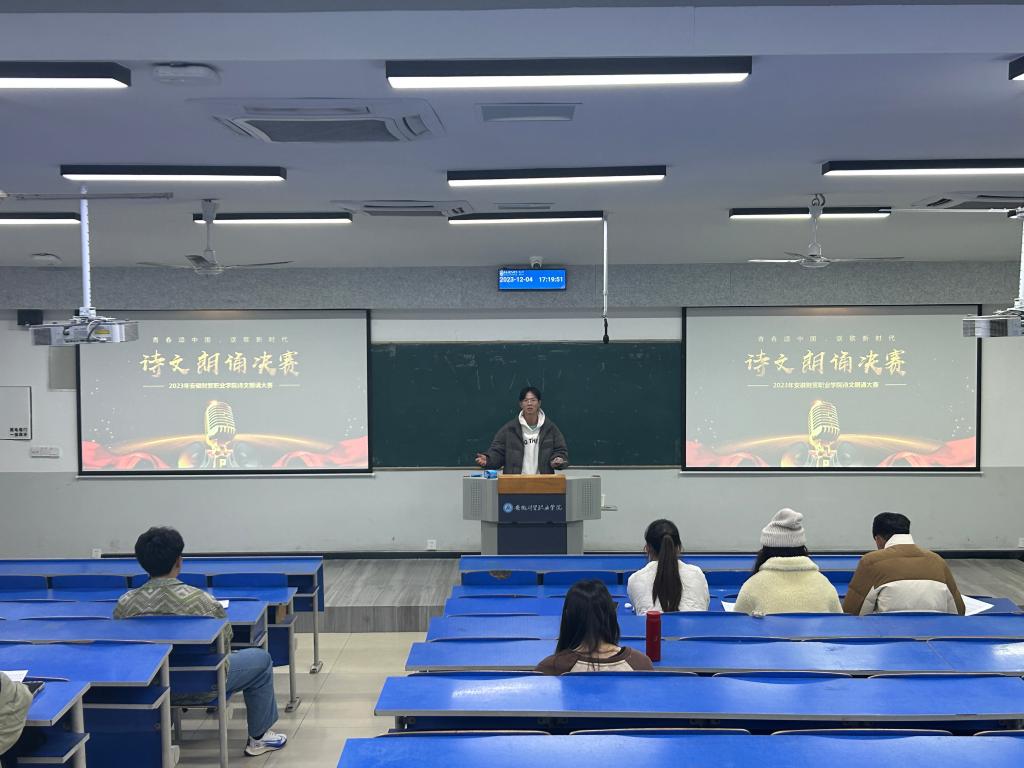 12月4日,校团委在翡翠校区5201教室举办第十七届全省大学生诗文朗诵校园选拔赛。本次比赛以“青春诵祖国,讴歌新时代”为主题,通过诵读方式讲述党的光辉奋斗历程、青年人的爱党爱国信仰、大学生的使命与担当,以诗诵情,以文咏志,展现举世瞩目的伟大成就,倡导热爱国家通用语言文字及中华优秀语言文化的价值观,为开启全面建设社会主义现代化国家新征程积蓄精神力量。