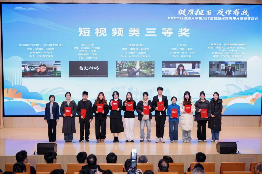 1月9日,安徽省通信管理局、安徽省公安厅、安徽省教育厅、共青团安徽省委员会、安徽省学生联合会主办,安徽医科大学、中国移动通信集团安徽有限公司、安徽青年报社承办的“2025年安徽省大学生反诈主题短视频海报大赛”颁奖仪式在合肥市举行。我校学子表现亮眼,由信息工程学院电子2501班徐晨阳主创的短视频《无声地“骗”》斩获短视频类三等奖,学校同时获评“优秀组织奖”,双重荣誉彰显育人成效。