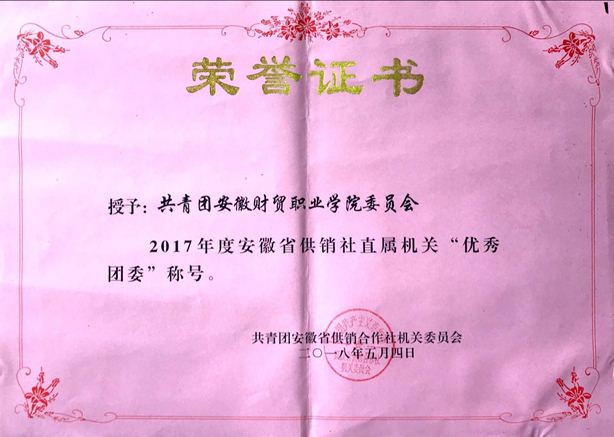 日前,共青团安徽省供销合作社机关委员会对2017年度省社直属机关优秀团员青年、团干部和基层团组织进行表彰。我校团委被授予“安徽省供销社直属机关优秀团委”,行知管理学院团总支书记左艳琼、朱熹文旅学院团总支书记汪双被授予“安徽省供销社直属机关优秀共青团干部”,校团委吕林全老师被授予“安徽省供销社直属机关青年岗位能手”,校团委学生副书记张月娟被授予“安徽省供销社直属机关优秀共青团员”。
