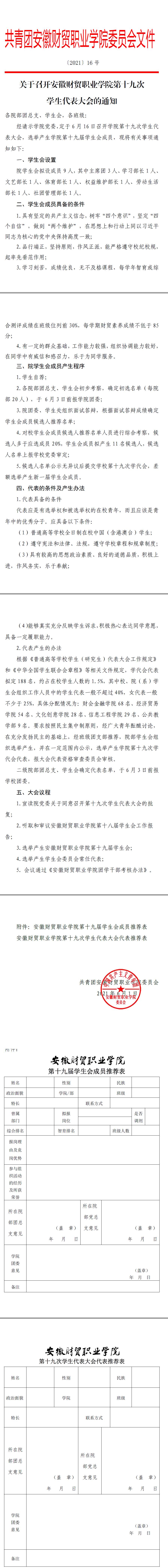 〔2021〕16号 关于召开安徽财贸职业学院第十九次学生代表大会的通知