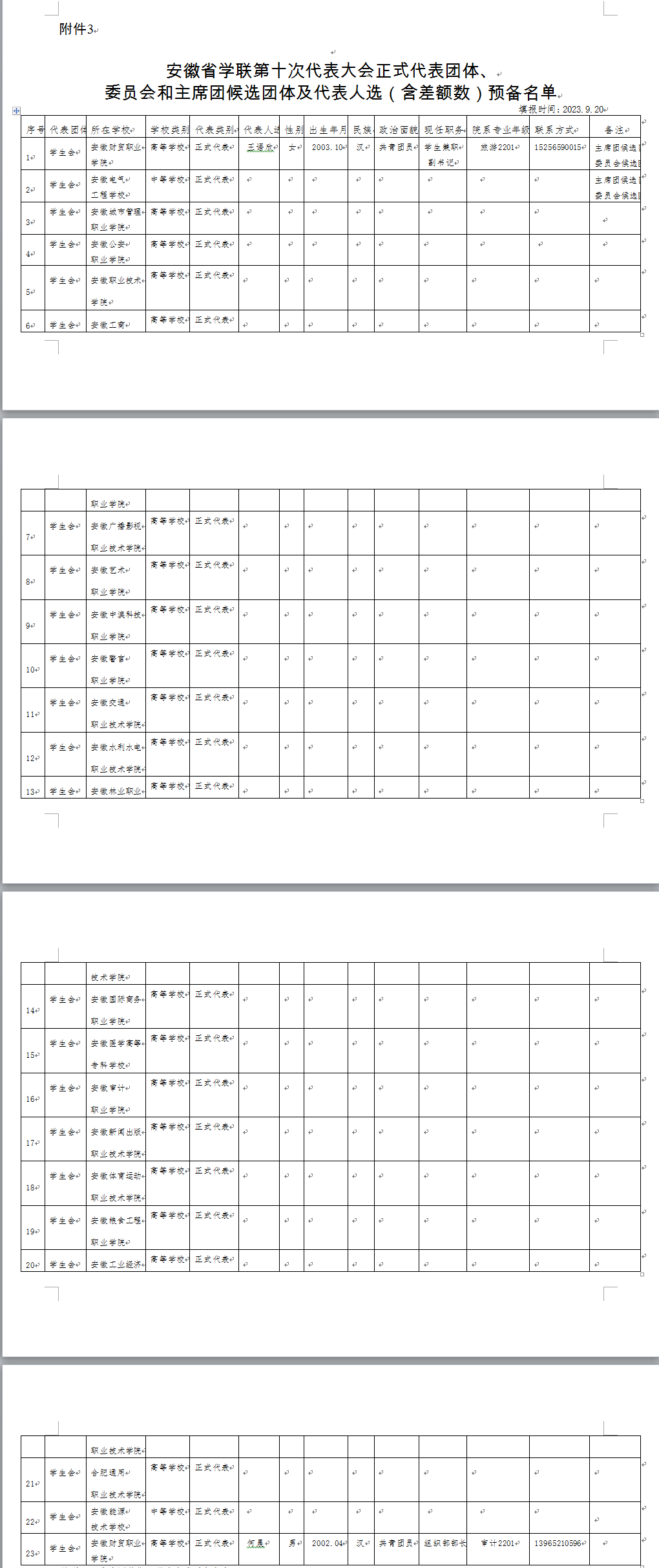 根据团省委、省学联部署要求,依据《关于推选安徽省学生联合会第十次代表大会代表团体和第十届委员会、主席团候选团体及各团体代表的通知》(皖青联[2023] 38号)文件精神,现将安徽财贸职业学院推选名单公示如下: