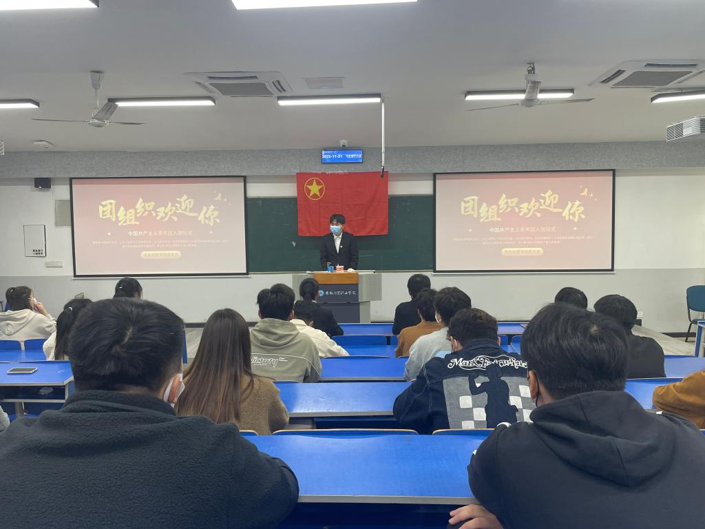 在庄严肃穆的国歌声中,2022年新团员入团宣誓仪式正式开始。仪式上,刘凯宣布了发展新团员的审批决定和新团员名单。老团员代表杨延萍带领新团员进行了入团宣誓,新团员们将右拳举起过肩,面对团旗庄严宣誓,话语铿锵有力;新团员代表龚志鹏作表态发言,承诺将会努力使自己成为一名优秀的共青团员,在学习、劳动中起模范带头作用,用热情去带动和影响周围的同学,传递正能量,不负青春,不辱使命。刘凯对新加入中国共产主义青年团的同学表示了祝贺,同时也提出了殷切的期望,并要求全体团员思想坚定、学习勤奋、积极奉献,用实际行动为团旗增光,为校园添彩。最后在昂扬的共产主义青年团团歌声中,整个仪式圆满结束。