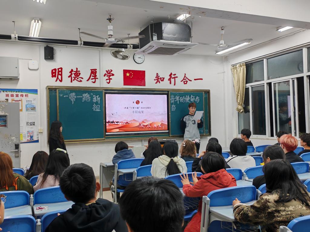 活动中,各班团支部书记带领班级同学观看了关于“一带一路”的影像资料,同学们深入讨论了“一带一路”倡议在经济、文化、科技和环境领域的影响。同学们也通过不同形式的活动和大家分享了各自的理解,也表达了作为新时代的青年要如何在实现中华民族伟大复兴的中国梦的生动实践中放飞青春梦想。