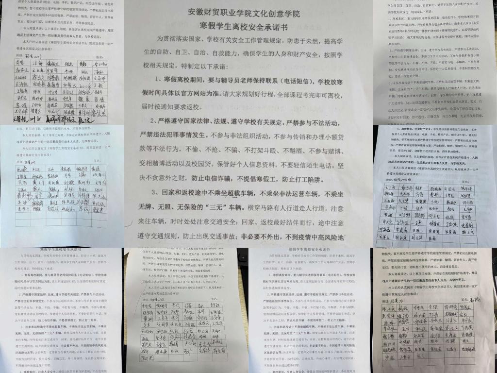 寒假临近,为切实增强学生假期安全意识,提升自我保护能力,度过一个安全、文明、健康、充实的假期,文化创意学院在安全离校主题教育活动基础上,开展了寒假假期安全承诺活动。