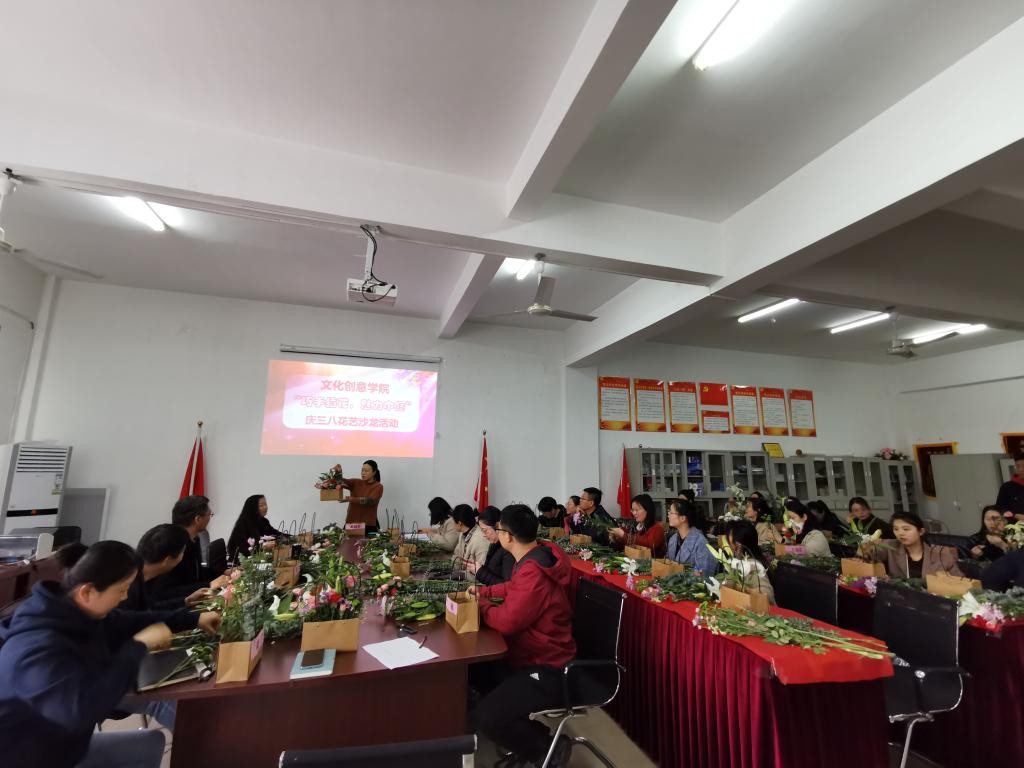 花香春意浓,巾帼绽风采。3月17日下午,文化创意学院在教师办公室举办“巧手插花,魅力巾帼”庆三八花艺沙龙活动。学校工会副主席许卫民、文化创意学院全体教职工参加了活动。