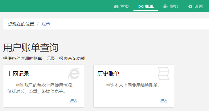 “账单”页面可以查询详细的上网记录、历史消费账单记录。