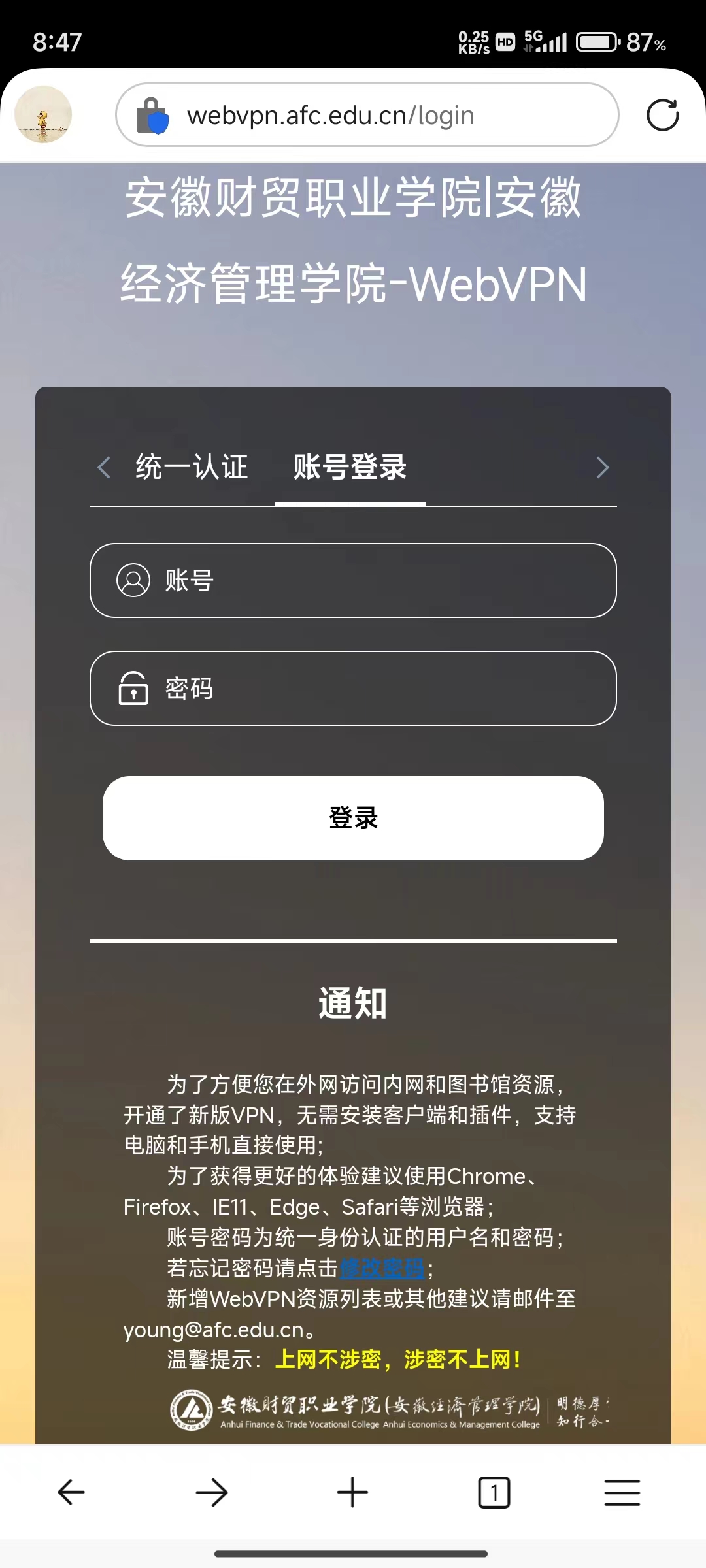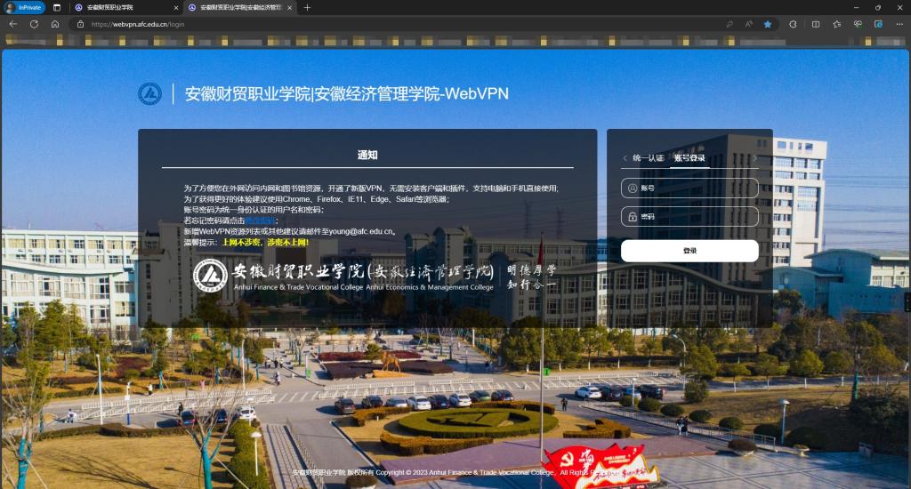如需申请WebVPN账号,请下载《安徽财贸职业学院VPN账号申请表》。