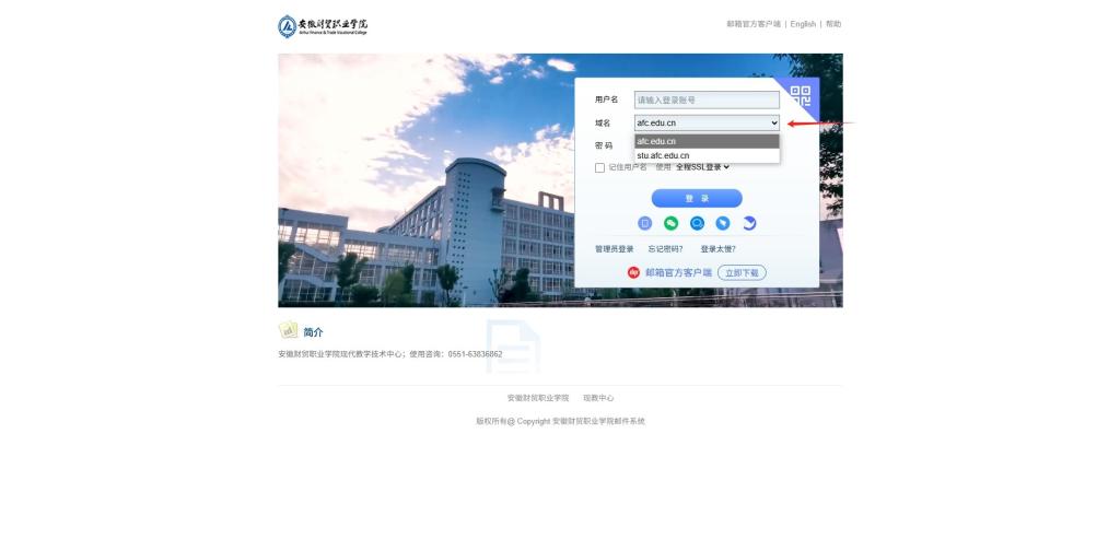 注意:登录时教职工请选择afc.edu.cn;学生请选择stu.afc.edu.cn。