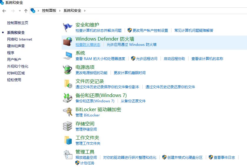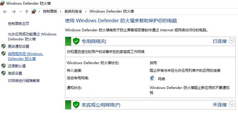 在控制面板选择系统和安全->Windows Defender防火墙->检查防火墙状态->启用或关闭Windows Defender防火墙->关闭Windows Defender防火墙,流程见下图。