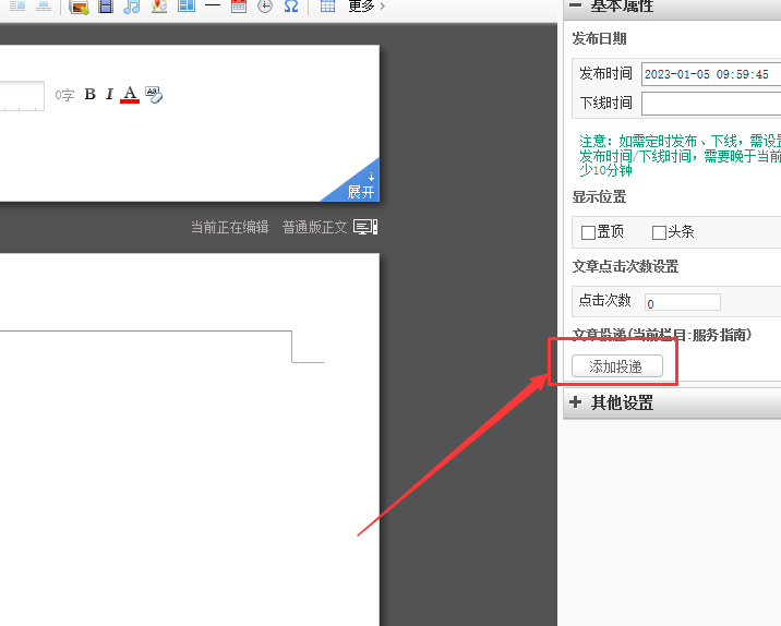 步骤一:文章编辑完成后点击右边添加投递按钮,如图1;
