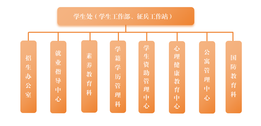 学生处(学生工作部、征兵工作站),下设招生办公室、就业指导中心、素养教育科、学籍学历管理科、学生资助管理中心、心理健康教育中心、公寓管理中心、国防教育科(征兵工作站)。