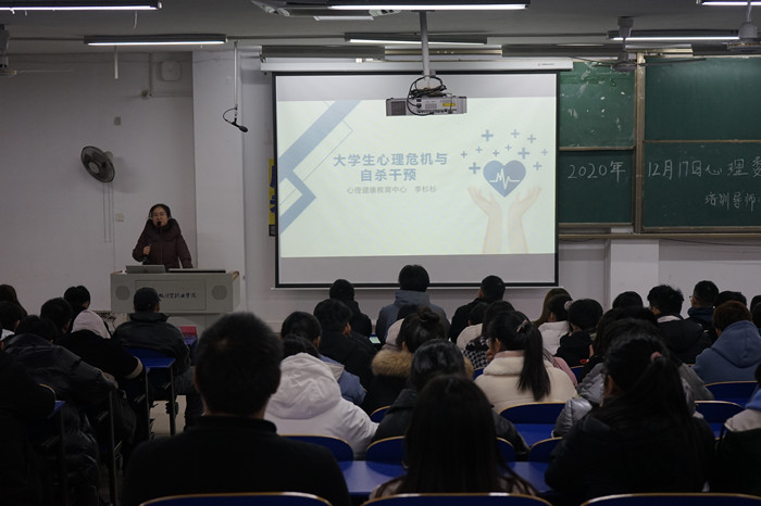 12月17日晚,学院第十二期新生班级心理委员培训第二讲在6103教室进行。本次培训由心理健康教育中心咨询师李杉杉老师主讲。她主讲的题目是《大学生心理危机与自杀干预》。各院部新生班级心理委员及学生会心理部干事共200余人聆听了本次讲座。