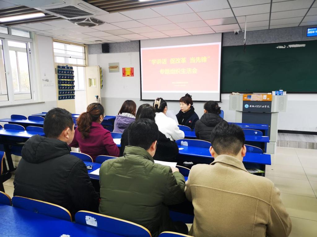 会上传达学习了《中共安徽财贸职业学院委员会关于开展“学讲话促改革当先锋”主题实践活动的通知》。每位党员都要立足岗位职责,对照习近平总书记历次考察安徽重要讲话精神和党的二十届三中全会精神,坚持把自己摆进去、把职责摆进去、把工作摆进去,严肃认真开展批评和自我批评。