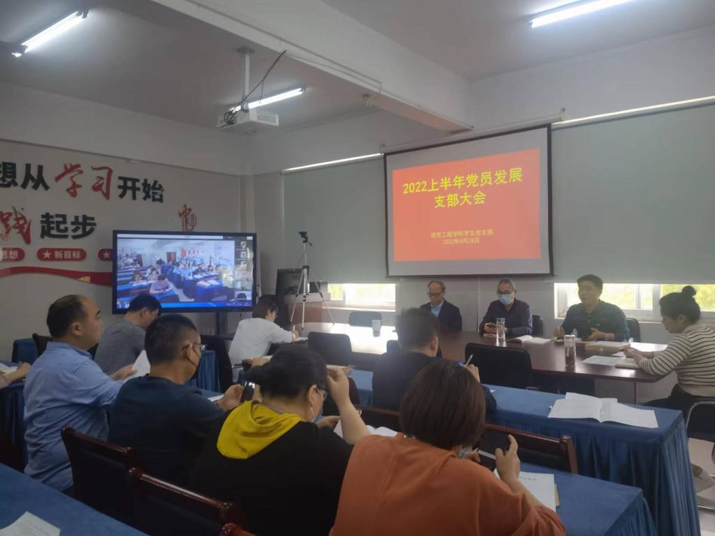 4月27日下午,信息工程学院学生党支部在综合楼313召开2022年党员发展暨预备党员转正大会,会议由学生党支部书记张伟伟主持。信息工程学院党总支书记邓庆安及师生党员参加会议。