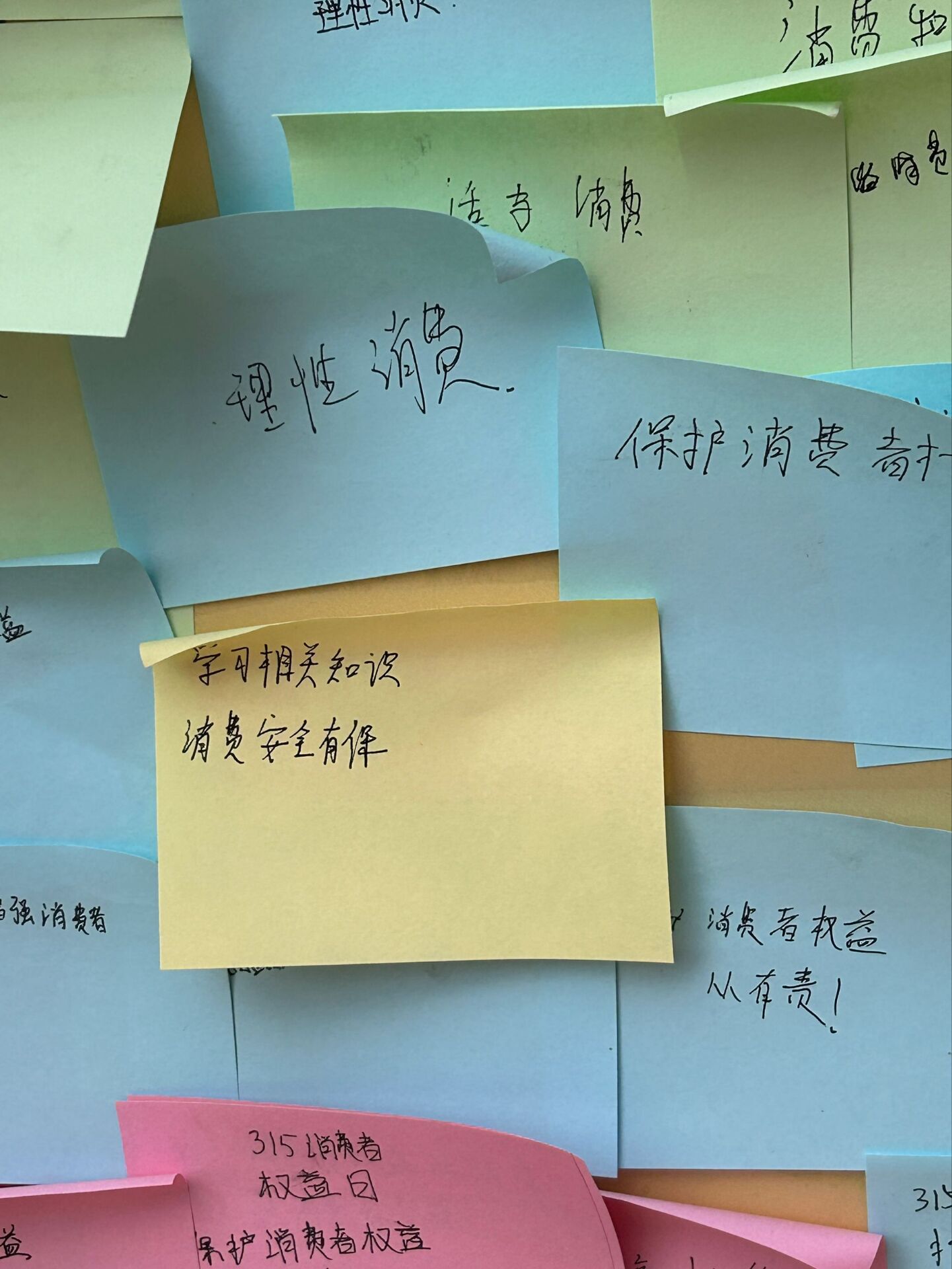 活动邀请同学们到印有“文明消费、绿色消费、健康消费、畅享消费”的横幅处签字并领取标签纸,写下自己在这个消费者权益日想说的话。现场非常火爆,同学们有序排队,纷纷写下自己心中的话贴在展示板上,“做好消费者指导工作,增强消费者维护权益能力”、“3.15国际消费者权益日,坚决维护消费者权益”、“理性消费,健康消费”、“学习相关知识,保障消费安全”......