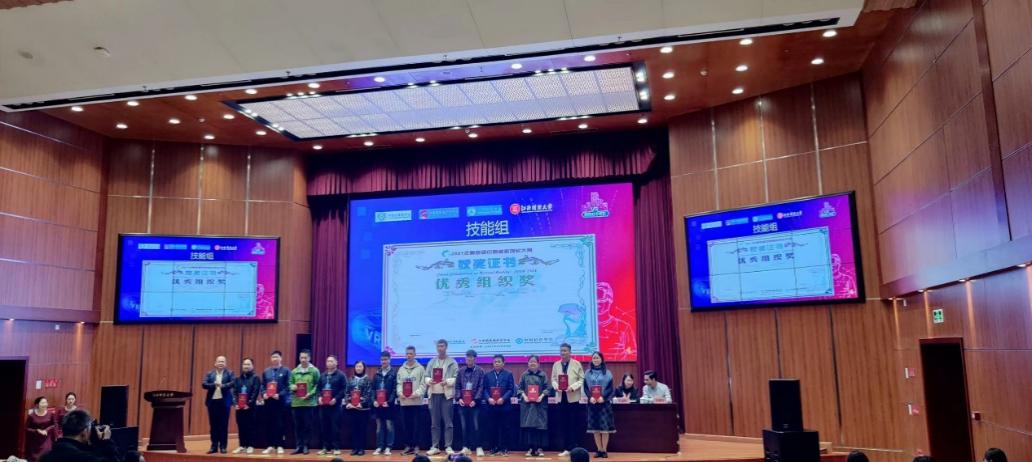 信息工程学院积极筹备,精心组织,两支参赛队(安徽财贸职业学院1队:桂子研、刘俊杰、李勋;安徽财贸职业学院2队:陈华奇、孙夺成、李佳悦)参加现场技能赛的比赛,顺利通过省赛晋级总决赛。10月17日,经过了6个小时的激烈比拼,凭着扎实的专业技能,最终两队均荣获一等奖的佳绩。18日下午,本次大赛承办校举行了隆重的颁奖仪式,中国虚拟现实大会组委会主任、中国科学技术大学刘利刚教授为比赛获奖学生颁发获奖证书。学校荣获“优秀组织单位”,指导老师沈杨、李沐烟荣获“优秀指导老师”。