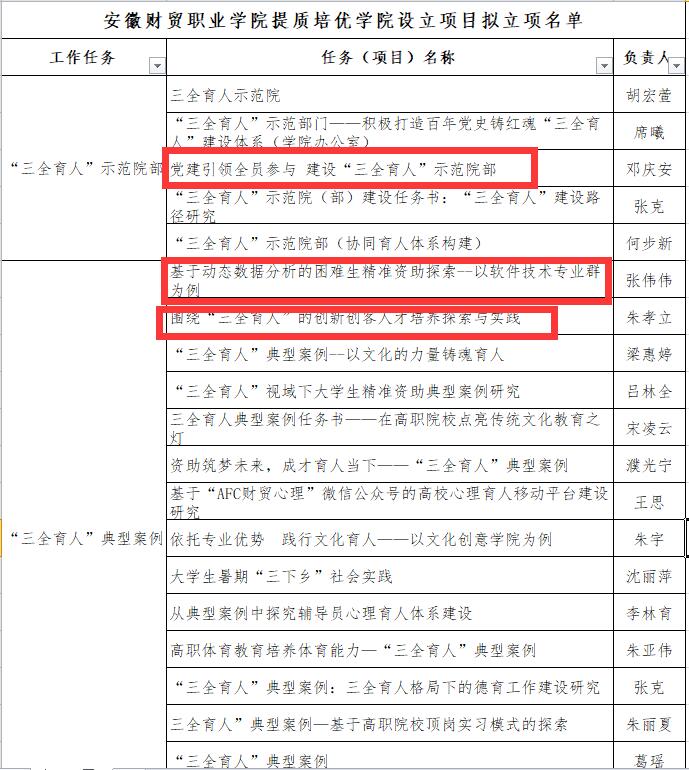 根据《安徽财贸职业学院提质培优全员行动计划实施方案》,经组织申报、专家评审,信息工程学院党总支书记邓庆安申报的《党建引领全员参与 建设“三全育人”示范院部》成功获批“三全育人”示范院部项目、党总支副书记张伟伟申报的《基于动态数据分析的困难生精准资助探索--以软件技术专业群为例》成功获批“三全育人”典型案例项目、朱孝立老师申报的《围绕“三全育人”的创新创客人才培养探索与实践》成功获批“三全育人”典型案例项目。
